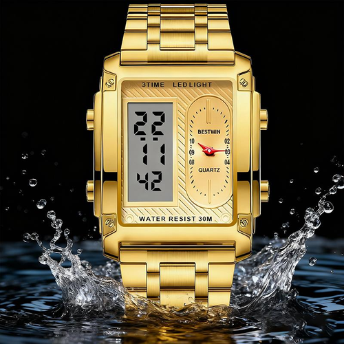 Men's Stainless Steel Band Watch – 3ATM Water-Resistant Alloy Digital Quartz Watch